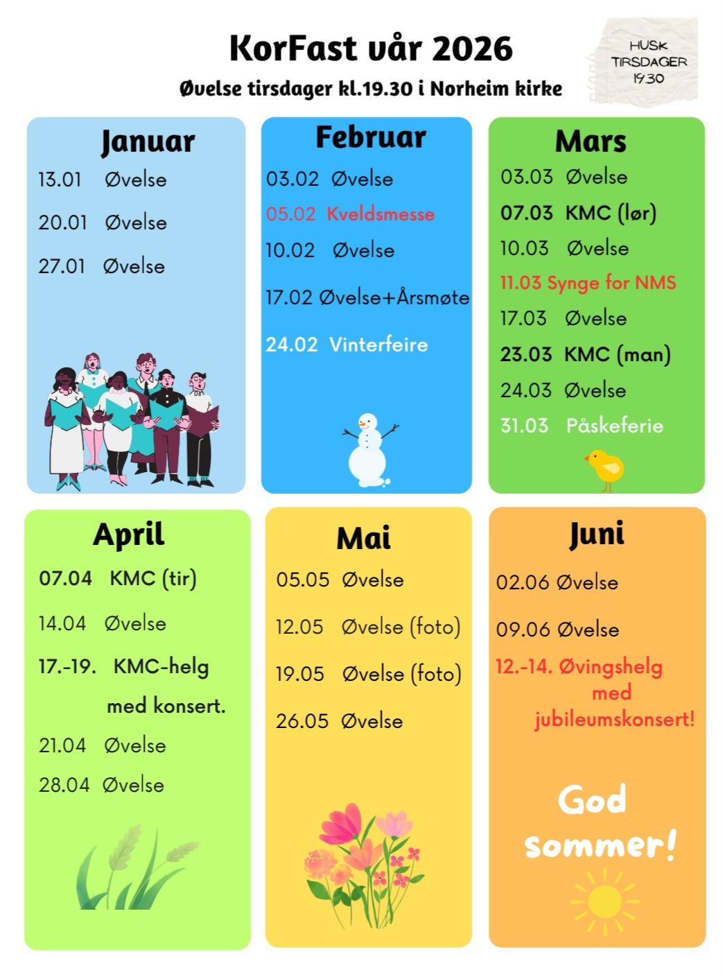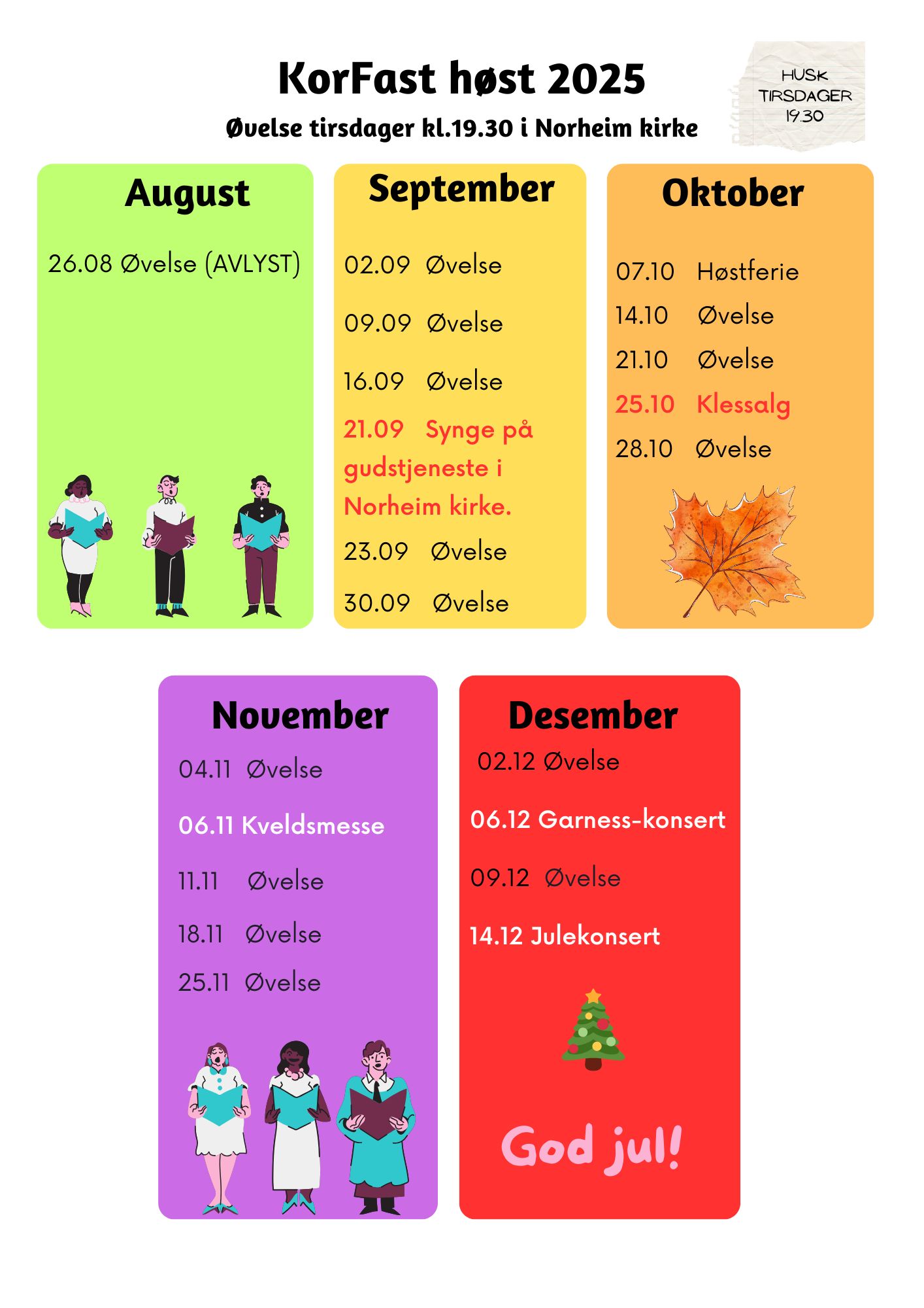 Vi øver tirsdager kl. 19.30-21.30. Det er ingen opptaksprøver, og koret har medlemmer i alle aldre.