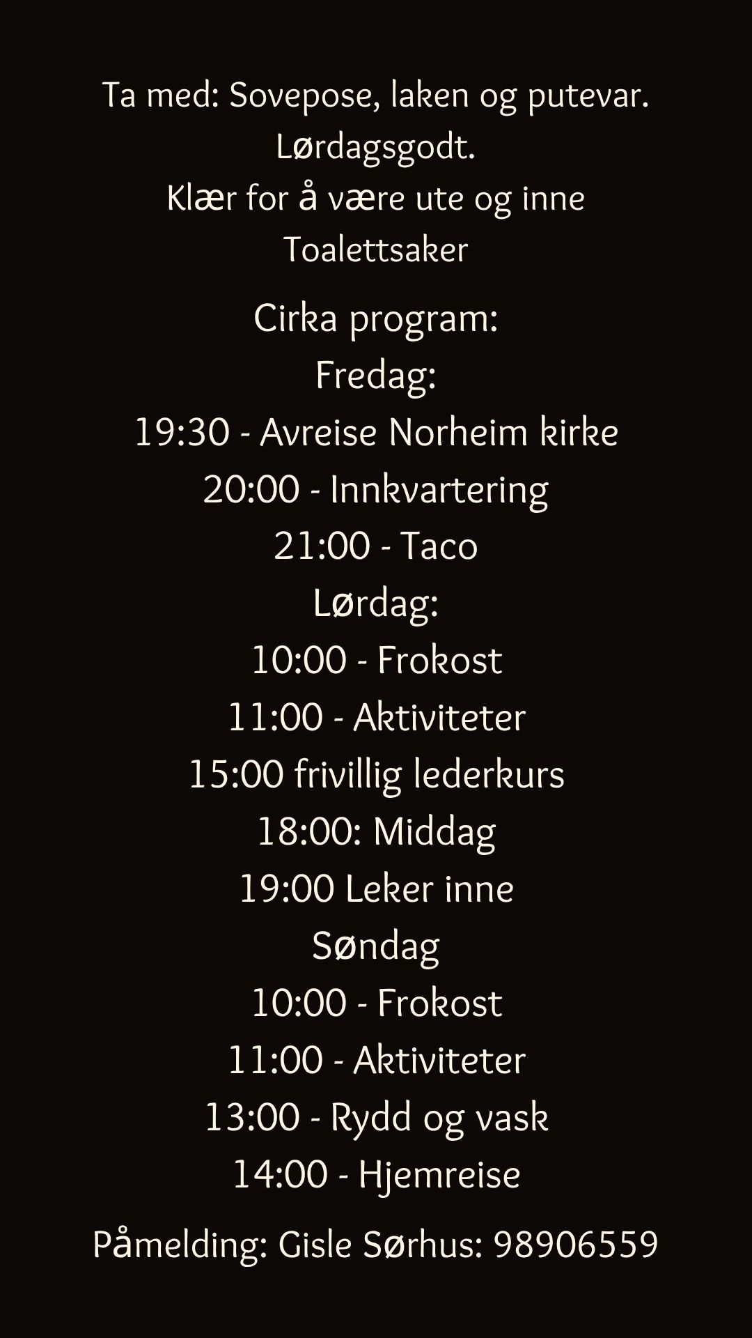 Fredag 17. Oktober til Søndag 19. Oktober inviterer vi til gratis hyttetur på Vigdarheim for ungdommer i ungdomsskole- og videregåendealder.